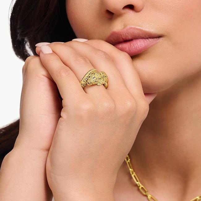 Ceci est un anneau de Thomas Sabo en forme de crocodile Rising fabriqué en 925 Loi en argent avec un bain d’or jaune 750. Il s’agit d’effet 3D avec des lignes de gravure fines et des pierres de zirconite noire et du vert émeraude à la main enragée à la main. Il en coûte 549 euros.